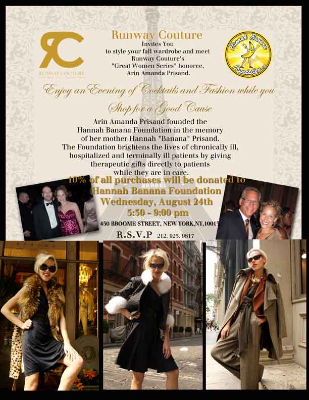 Runway Couture invites you to shop for a cause while it honors Arin Amanda Prisand as part of its "Great Women Series." 10% of all purchases will benefit Hannah Banana Foundation on August 24, 2011 from 5:30-9PM at Runway Couture (450 Broome Street). Cocktails, Fashion Show, Hors D'Oeuvres. Please RSVP 212-925-9817